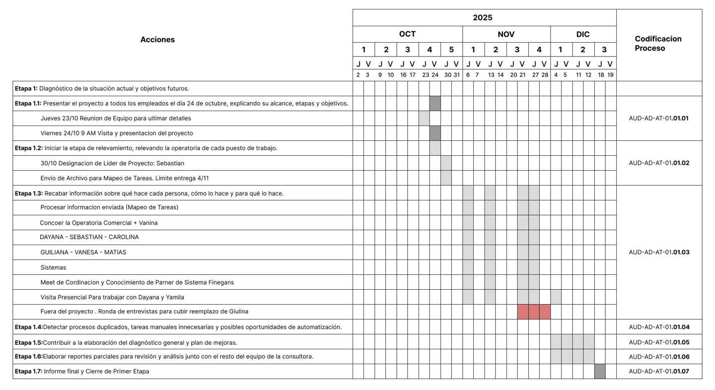 Llevar adelante la presentación del Proyecto de Gestión Integral y comenzar con la etapa de relevamiento de información interna, con el propósito de identificar, analizar y documentar los procesos actuales de trabajo en la empresa, detectando oportunidades de mejora y eficiencia.